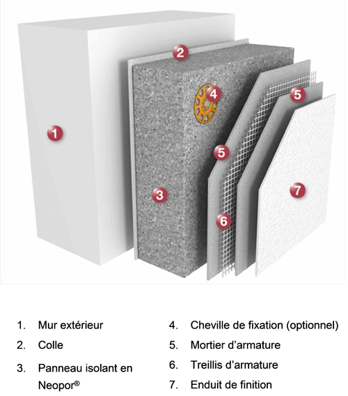 Le panneau de polystyrène est fixé directement sur la paroi extérieure du bâtiment, par collage. Un profilé de base est fixé mécaniquement sur la façade. Il est destiné à accueillir la première rangée de panneaux, tout en évitant leur glissement. Un enduit d’accrochage est ensuite réalisé sur l’isolant, dans lequel est alors installé un treillis d’armature en fibres de verre. Il sert lui-même de support à une couche de fond pour égaliser la surface. L’enduit de finition peut alors être réalisé.